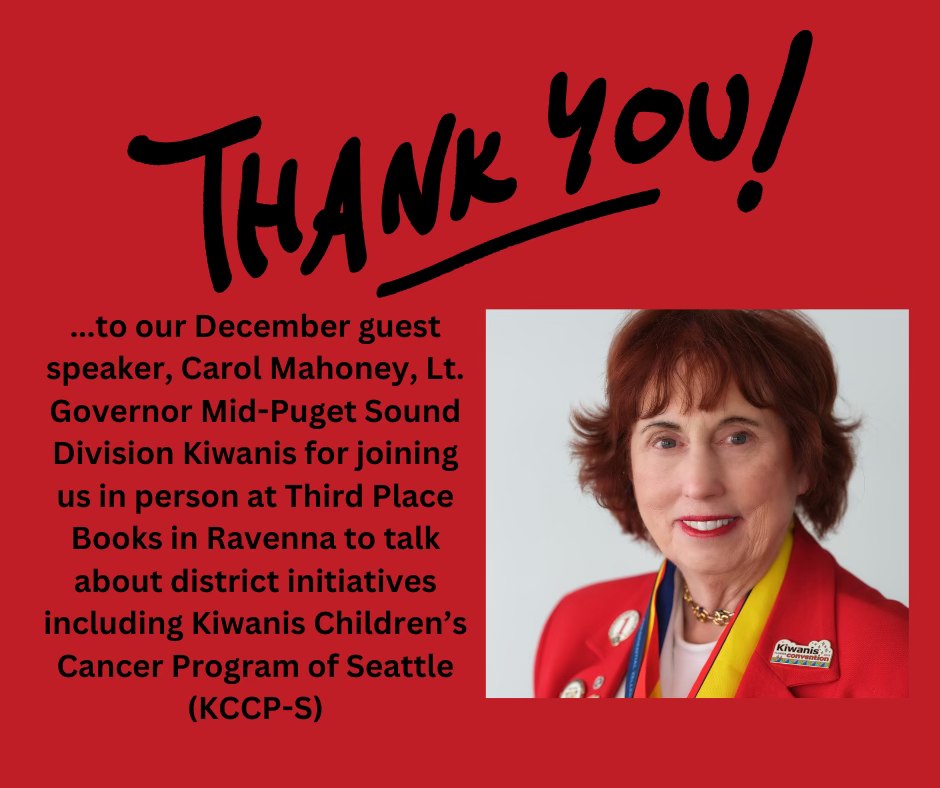 We had a great time at our December 10, 2024 meeting in the cafe at Third Place Books Ravenna! Thank you to our speaker Carol Mahoney, Lt. Governor Mid-Puget Sound Division Kiwanis and PNW Chair of Kiwanis Children’s Cancer Program of Seattle (KCCP-S)! Carol talked with us about district initiatives including KCCP-S, which funds pediatric hematology/oncology research fellowships at Seattle Children’s Hospital. We were proud to donate $5,000 to KCCP-S to help fund these fellowships and find a cure for pediatric cancer!