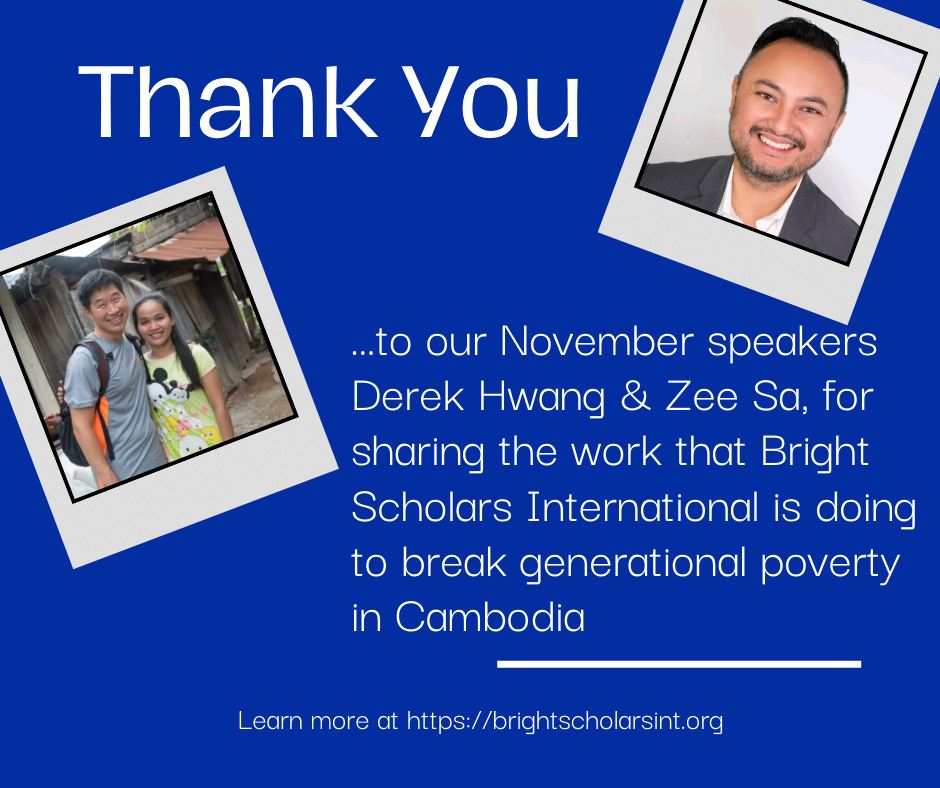 We’re grateful to University Kiwanis members Zee Sa and Derek Hwang for presenting at our November 12, 2024 meeting to share the work they’re doing with Bright Scholars International to break generational poverty in Cambodia – providing educational subsidies and in-person support to families to help their children access an education that opens doors to employment, health care and stable housing that would otherwise be impossible. There are currently 30 kids in the program with 50 more on the waiting list. Learn more at brightscholarsint.org